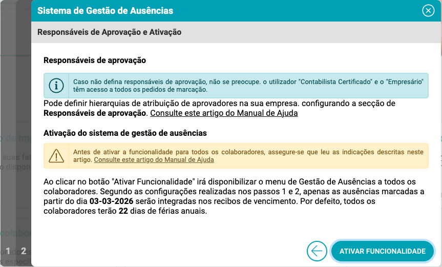 Menu Empresa » Configurações » Assistente de Configuração. Na secção Convide os seus colaboradores, clique no botão "Configurar e ativar Gestão de Ausências →".