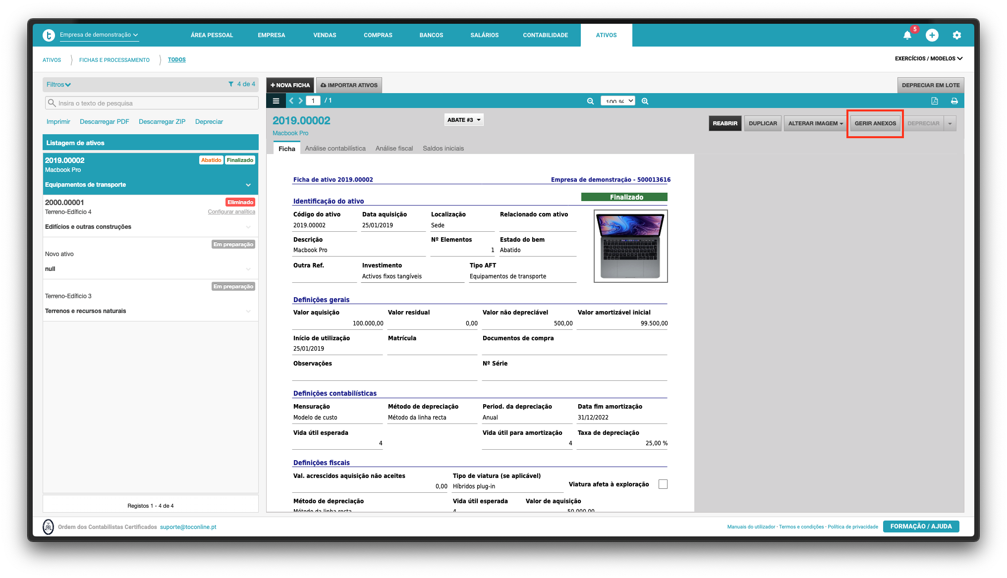 Na ficha de cada ativo existe um botão Gerir Anexos, onde pode ver todos os documentos associados ou adicionar novos.
