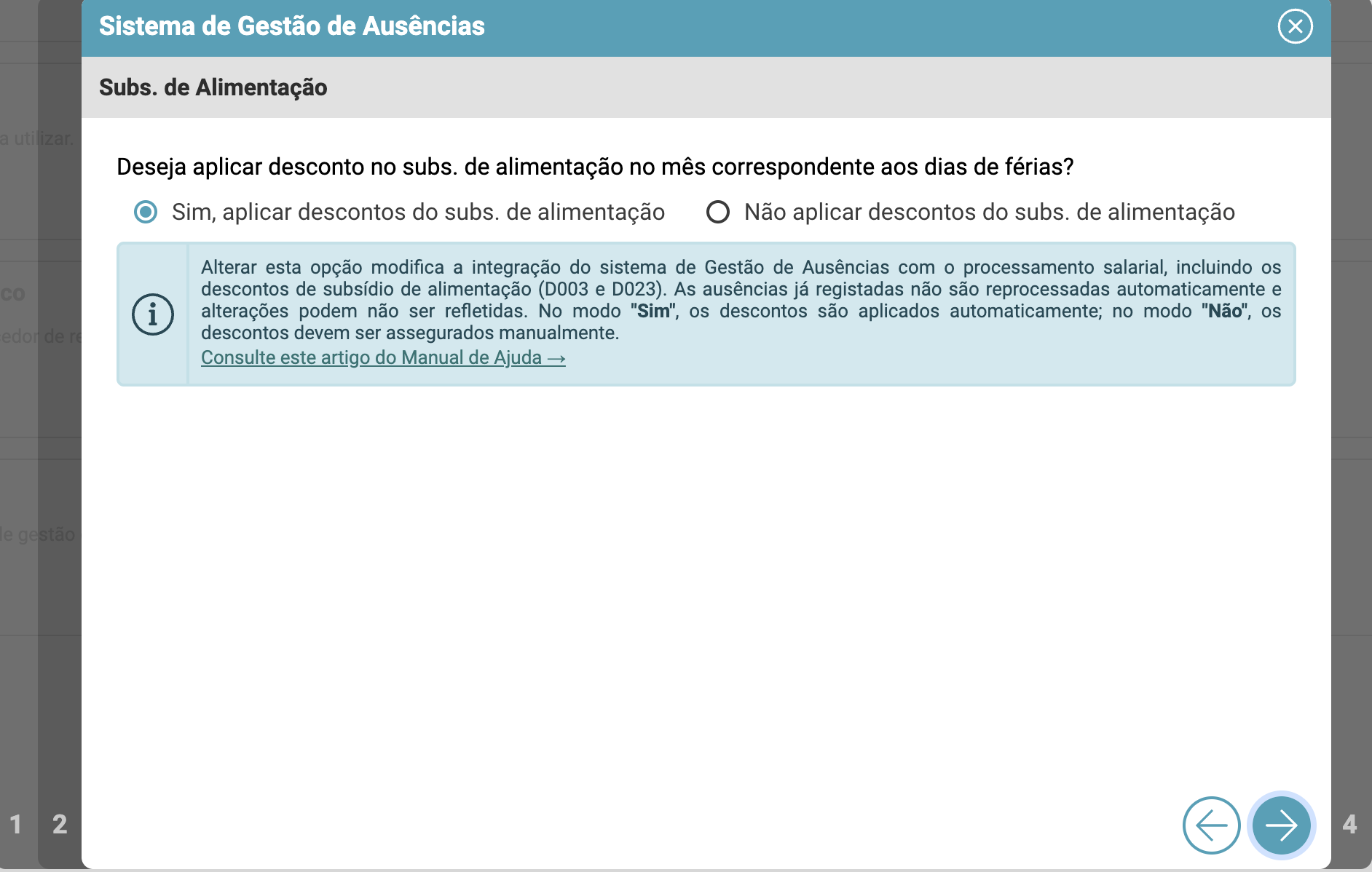 Ao ativar o módulo de Gestão de Ausências, é necessário definir como as ausências interagem com o processamento salarial — nomeadamente, se o subsídio de alimentação deve ou não ser descontado automaticamente nos meses em que existem férias.